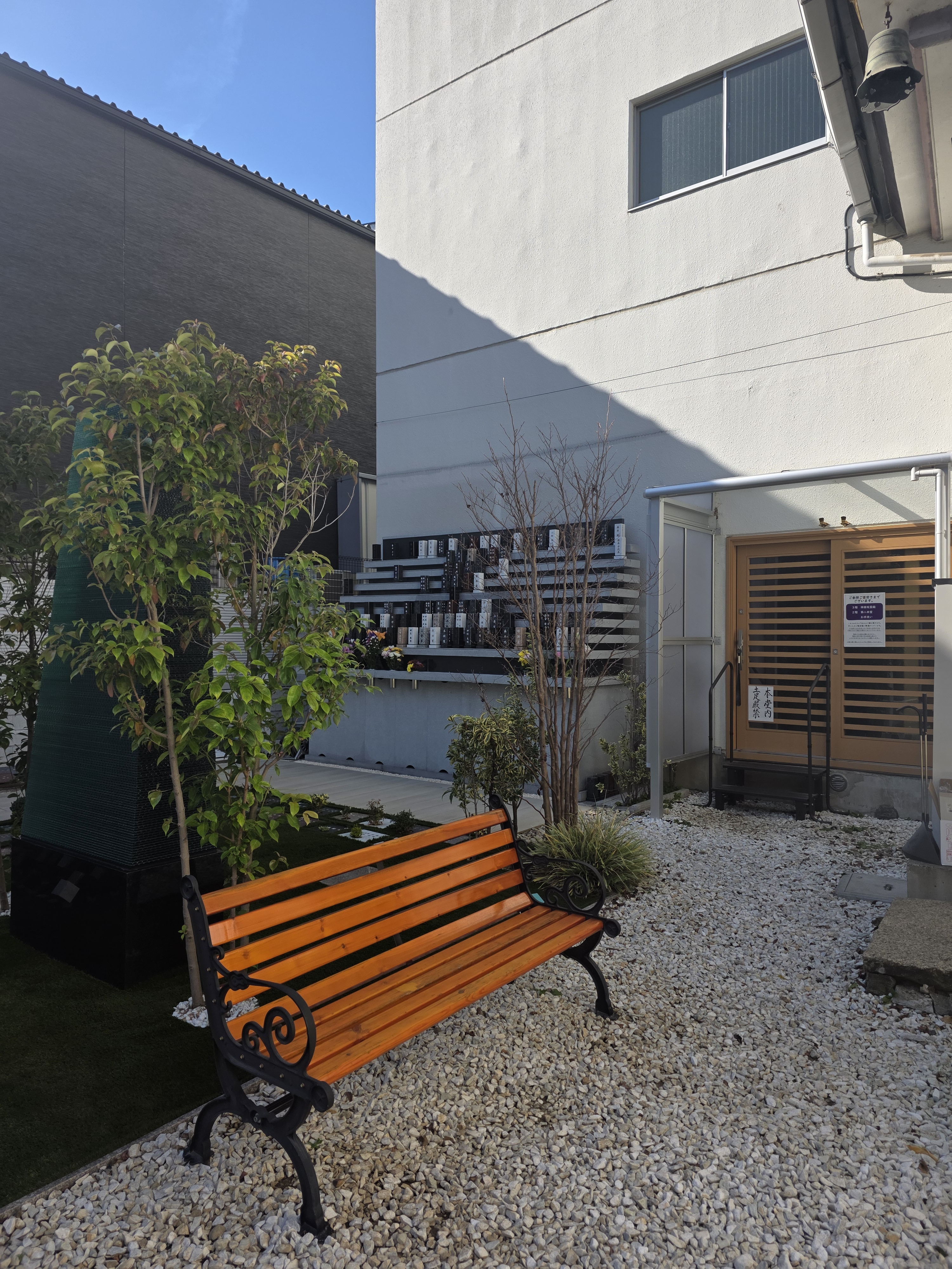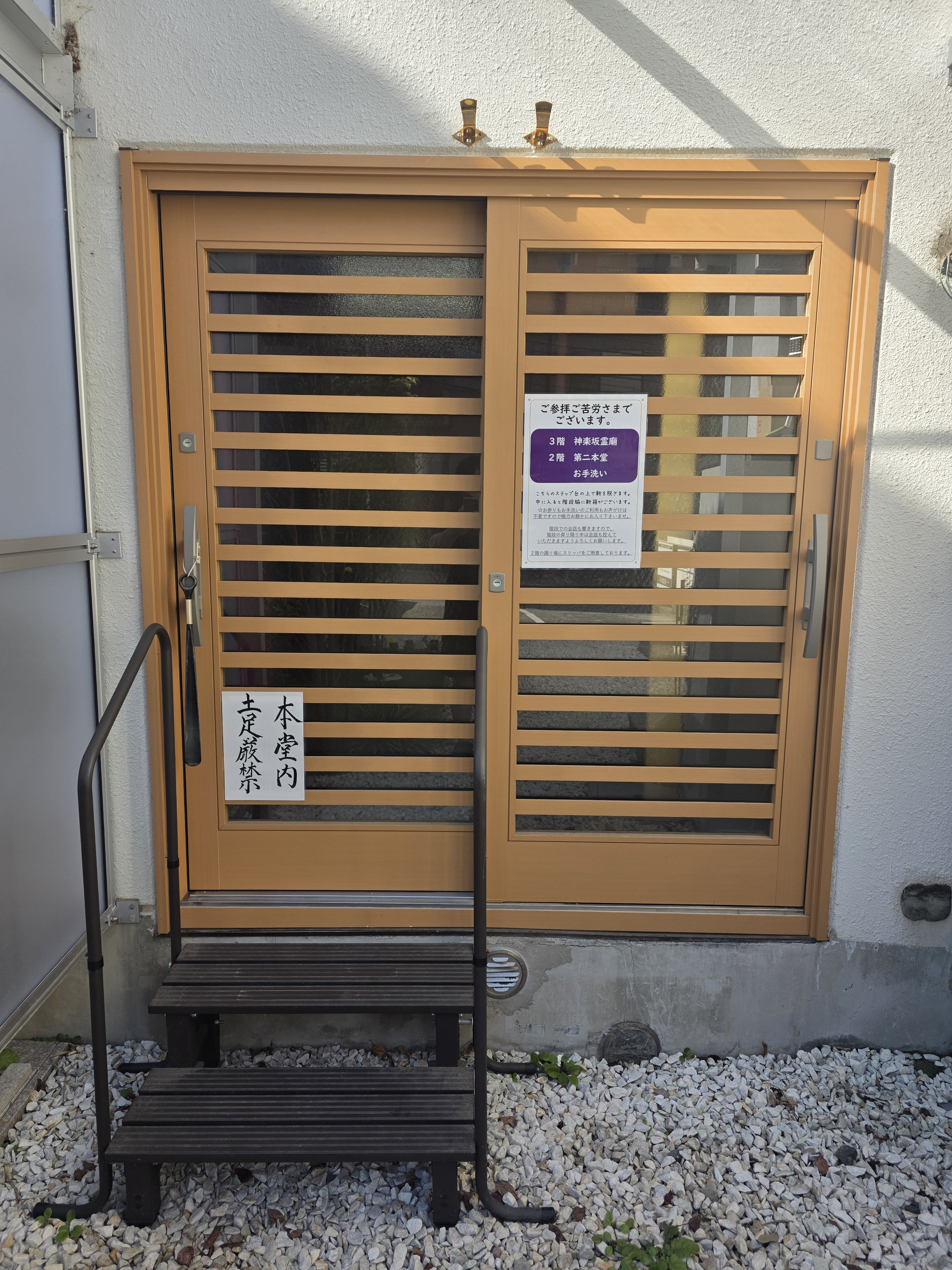 本堂入口の左側に第二本堂入口がございます。本堂に向かって左側の扉から入るとすぐ階段があり、2階の左手にございます。お墓参りにいらした方もお声がけなく自由にご利用下さいませ。本堂にはパーテーションがあって法要中であっても参列者に姿を見せることなくご利用いただけますが、音は筒抜けですので極力静かに出入りするようお願いします。「失礼します」等もなくて結構でございます。綺麗に使っていただければ幸いです。